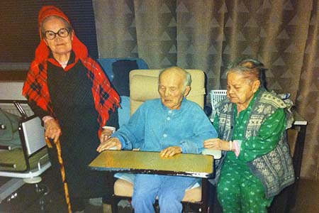 Op dag drie was er gelegenheid tot ontsnapping, doordat ik met mijn infuusstaketsels nu wat mocht rondwandelen. Naar huis was uitgesloten, men dacht nu aan een longembolie en tot overmaat van ramp belde de Alarmcentrale vanuit Nederland. een ernstig persoon informeerde dringend naar mijn gezondheid. Dan gaat het dus echt niet goed met je.  Het ziekenhuisje leek geheel ingericht op de verzorging van dementerende bejaarden, en stelde een intrigerende verzameling foto’s aan de wand ten toon, waarvan er hier enkele te zien zijn. Er was een soort sanatorium-balkon, met achter glas uitzicht op een meer. Er waren overal schommelstoelen, er was een bejaarde die ’s ochtends voor de buis in de ‘ontspanningsruimte’ werd geposteerd, daar de hele dag kreten slaakte en die ’s avonds weer werd weggehaald. Schommelend bracht ik de middag op het sanatoriumbalkon door, om maar niet naar de kamer terug te hoeven, de pap stond naast mij koud te worden. Zo voelt het dus wanneer je honderd bent.