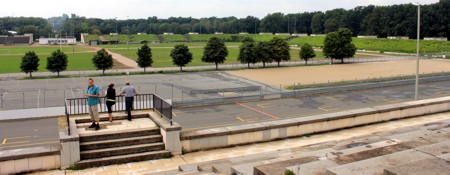 Achter mij ploeterde een Nederlandse vader met zijn zoontje in de hitte de tribune op. Het was “Führerweer”. Stralend en heet. “Ik wil kijken of ik nog ergens een steentje van deze tribune los kan krijgen”, verkondigde de man, “voor in de verzameling.” Dergelijke plekken trekken nogal eens neo-nazi achtige types aan. Ooit zag ik bij de restanten van Hitlers Berghof een groepje van dat soort, een Duitse oorlogsvlag uitspreidend, snel op de foto en dan weer weg. Geen haan die daar naar kraaide, maar je lokt het ook wel uit als je dat soort plekken met duidelijke bewegwijzering en grote borden aan gaat kondigen.