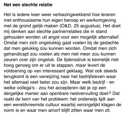 De briefschrijver hiernaast zou juist verwonderd moeten zijn over het feit dat wij docenten ondanks alles toch maar doorgaan, ook al hebben wij nog zo veel ( al dan niet terecht ) te klagen. Wij stellen namelijk altijd nog ons beroep centraal, en dat is het overbrengen van kennis aan jonge mensen die nodig hebben. Wáár in het bedrijfsleven draait men zoveel onbetaalde overuren? Als elke docent zijn extra uren, ook in de steeds korter wordende vakanties zou declareren, dan zou de firma onderwijs binnen no time failliet zijn. Ze klagen ook ja, maar daar blijft het eigenlijk wel bij. Ze mopperen nauwelijks over hun salaris. . Ze zeuren niet over het feit dat ze dat bedrag grotendeels op moeten souperen wanneer ze- uitsluitend in het hoogseizoen tegen exorbitante prijzen op vakantie kunnen, waar iemand in het bedrijfsleven op elke ander moment dat voor een fractie van het bedrag zou kunnen doen. Ze laten zich meewarig uitlachen op feesten en partijen. Alle onderwijsveranderingen door de jaren heen hebben ze uiteindelijk, al dan niet met frisse tegenzin, opgepakt en geprobeerd er het beste van te maken om zo de leerlingen zo effectief mogelijk van dienst te kunnen zijn. Ze vullen braaf hun 360 graden-feedbackformulieren in, hun POP-gepsprekken, hun PAP-gesprekken. Vaak tegen beter weten in. Kom daar elders eens om.