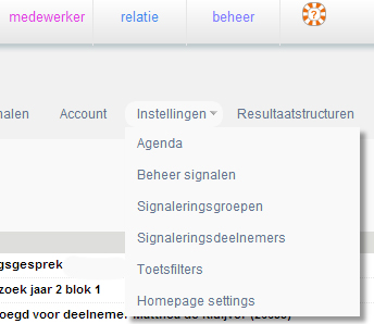 Ik log in, zoek naar cohort, prestatiedossier, bekijk de relaties, de resultaatstructuren, beheer de signalen, check de signaleringsgroepen, controleer de signaleringsdeelnemers, bekijk de toetsfilters en voor de zekerheid werp ik nog een blik op de homepage settings.
