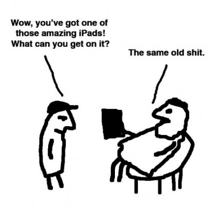 Als ik nu niet gauw een iPad krijg, word ik gek. Ik wil zo’n ding, ik lig er ’s nachts wakker van, door het gebrek aan iPad voel ik me minder man, ik word er humeurig van, volgens mij ook impotent, ik slaap er slechter door en ik krijg steken in mijn maag. Ik zou groen en geel van narigheid worden als één van mijn collega’s zo’n ding eerder heeft dan ik. Je kunt gewoon niet goed functioneren zonder zo’n ding, je leven is minder rijk en uitdagend. Mogelijk word je alcoholist en verdwijn je elk weekend naar de kroeg, of je gaat ergens de hele zondag in de regen onder zo’n groene paraplu in een meertje langs de A1 zitten vissen.