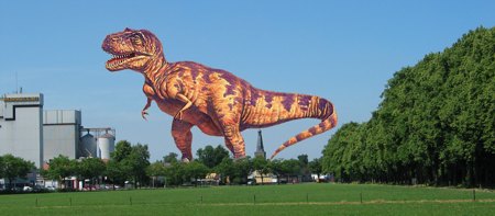 Maar goed, tijdens mijn wandeling hoorde ik vanuit de bosrestanten plotseling een dreunend geluid. De poema kon het niet zijn, want die is door de gemeente Ede geclaimd. Vogels en kippen fladderden verschrikt op, en schichtig keek ik over mijn schouder, om daar tot mijn afgrijzen de monsterlijke gedaante van een Tyrannosaurus Rex te ontwaren.