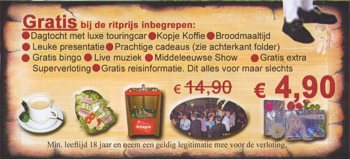 De dag zal gepaard gaan met veel humor ( ongetwijfeld! ) en entertainment, “waarbij u allen getuige van bent“. Het kado-pakket “als reisherinnering” bevat naast genoemde zaklantaarn bijvoorbeeld “voor de Dame:” “een porseleinen pop van ca 42 cm groot met echtheidscertificaat“, en een “6-delige emaille bewaar pannenset” waarvan de grootste een doorsnede heeft van maar liefst 18 centimeter! Daar kun je met enige moeite toch wel een ei in proppen. Niet koken trouwens, want de deksels zijn van plastic en de pannen zelf lijken mij van blik. Tot overmaat van feestvreugde krijgt iedere GAST nog een extra verassingscadeau, wat bij aankomst wordt uitgedeeld door de eenzame Willem I . Clubleden kunnen echter ook nog kiezen uit bijv. een “draadloze strijkijzer met instelbaar temperatuur en stoomfunctie” ( ook van plastic, dus niet boven de 30 graden stomen ). Da’s nou pech, want ik ben geen clublid. De reis er naar toe zal ruim twee uur vergen, € 4,90( in plaats van € 14,99! ) betalen aan de buschauffeur s.v.p, opstapplaats bij mij om de hoek!