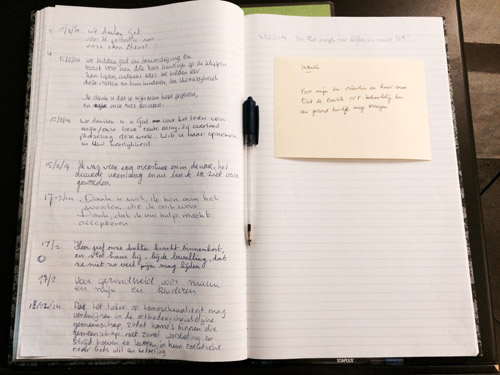 En dat is nou het mooie, wanneer je als toerist weer zo’n kerk bezoekt in een grote stad te midden van razend verkeer of ergens op een weitje hoog in de Alpen: je komt in een soort hemel van rust en stilte terecht, waardoor je automatisch weer een beetje gaat geloven, waardoor je automatisch weer een beetje kind wordt, verlangend naar het rotsvast vertrouwen van toen. Een zo’n enorme kathedraal, daar zie je mensen uit alle windstreken van de wereld, in de eenzaamheid van hun drukke leven, kortstondig knielend in een kort moment vóórdat ze weer verder reizen, biddend tot hun god, voor mensen ergens op diezelfde wereld die zo heel erg hard en harteloos is geworden. En bij het licht van flakkerende kaarsen lees je de teksten in het gebedenboek, zoals deze intrigerende wanhoopskreet, laatst gezien, ergens in een kerk, waar het soms nog heel goed toeven is:
