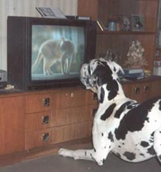 Steeds meer huisdieren raken verslaafd aan televisiekijken. De grote boosdoener zouden de televisietoestellen met HDTV scherm zijn. Een Belgische (!) site speurde het net af naar getuigenissen. Zo is er het verhaal van de kat Snoopy, die tot 20 minuten lang geboeid zit te staren naar een tv-programma. Vooral als er vogels, vissen of andere dieren op het scherm verschijnen, is poeslief niet te houden. In sommige vallen volgt er zelfs een regelrechte aanval richting televisie. Op een andere website maakt men melding van honden die blaffen wanneer op het scherm een deurbel gaat of van katers die vruchteloos azen op de ,,televisie-vissen”. Sommige trouwe viervoeters houden zelfs de bewakingsbeelden van de woning in het oog in de hoop een vroegtijdige glimp op te vangen van hun huiswaarts kerende baasje. Dat wordt straks nog wat als al die mooie flatscreens in HDTV gaan uitzenden.Niet alleen de kinderen vechten om de buis, maar vader krijgt bij het voetbal kijken nu ook concurrentie van de Deense Dog of de Schnauzer. Zal een behoorlijk gekrakeel worden daar in de huiskamer. Mijn eigen kat heb ik één keer kunnen betrappen op een uithaal naar een goudvis, die tijdens een screensaver over mijn scherm zwom. Het lijkt me dan ook raadzaam om het scherm in de toekomst van stevig traliewerk te voorzien, als ik zo naar de hond op het plaatje kijk. Hier moet voor Martin Gaus ook een nieuwe markt liggen.