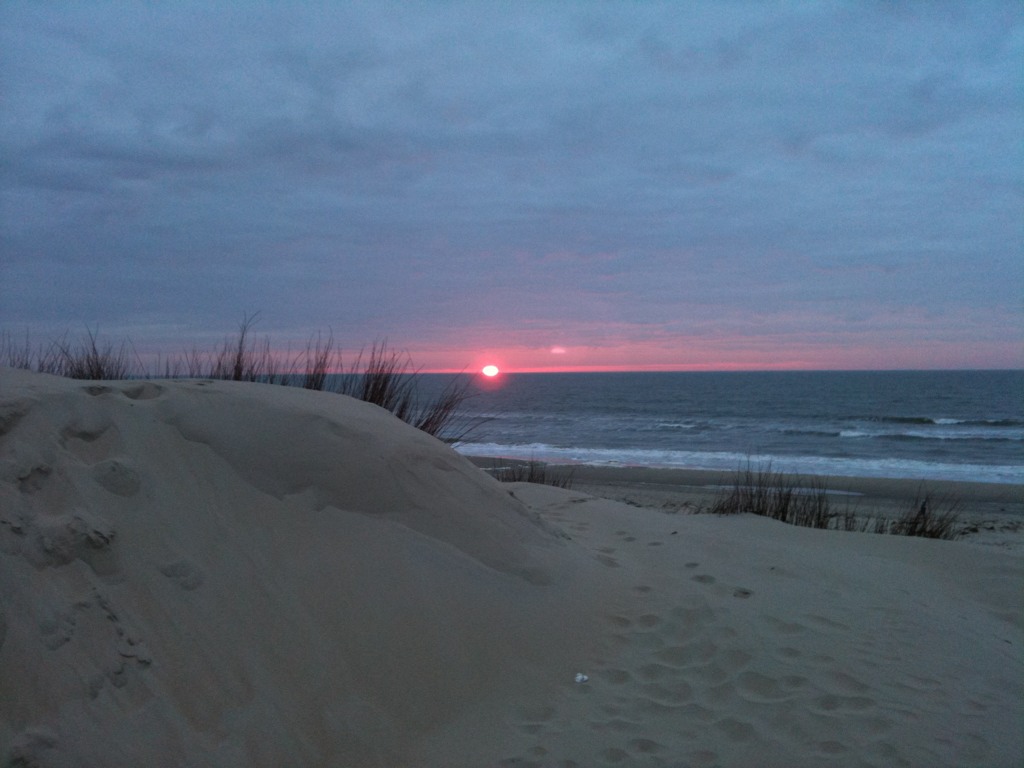 Vroeg slapen dan maar, want in het hotel blijkt het internet niet te werken, de verwarming komt maar niet op gang en het mobiele netwerk hapert. Verstoken van alles, lijkt het. Alleen jezelf nog om mee bezig te zijn. Als ik het duin op loop, langs de verlaten strandtent in aanbouw, draai ik mij nog één keer om. En ineens is daar, vlak boven de grauwe zee, door een onvoorziene spleet in het egale wolkendek, een felle, bloedrode zon zichtbaar, die de kou niet meer wegneemt, maar toch warmte geeft. Een, twee minuten slechts, dan vonkt een laatste straal en is hij verdwenen achter die eindeloze horizon. Een grijs gordijn van regen trekt over zee naderbij. Als ik snel doorloop, hou ik het nog droog.